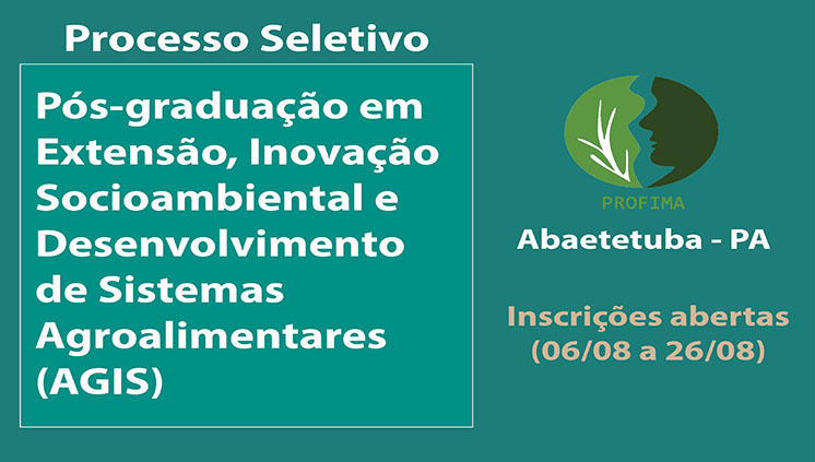 O PROFIMA/NUMA e a FADECAM-Abaetetuba abrem inscrições para o curso de especialização em Extensão, Inovação Socioambiental e Desenvolvimento de Sistemas Agroalimentares (AGIS).